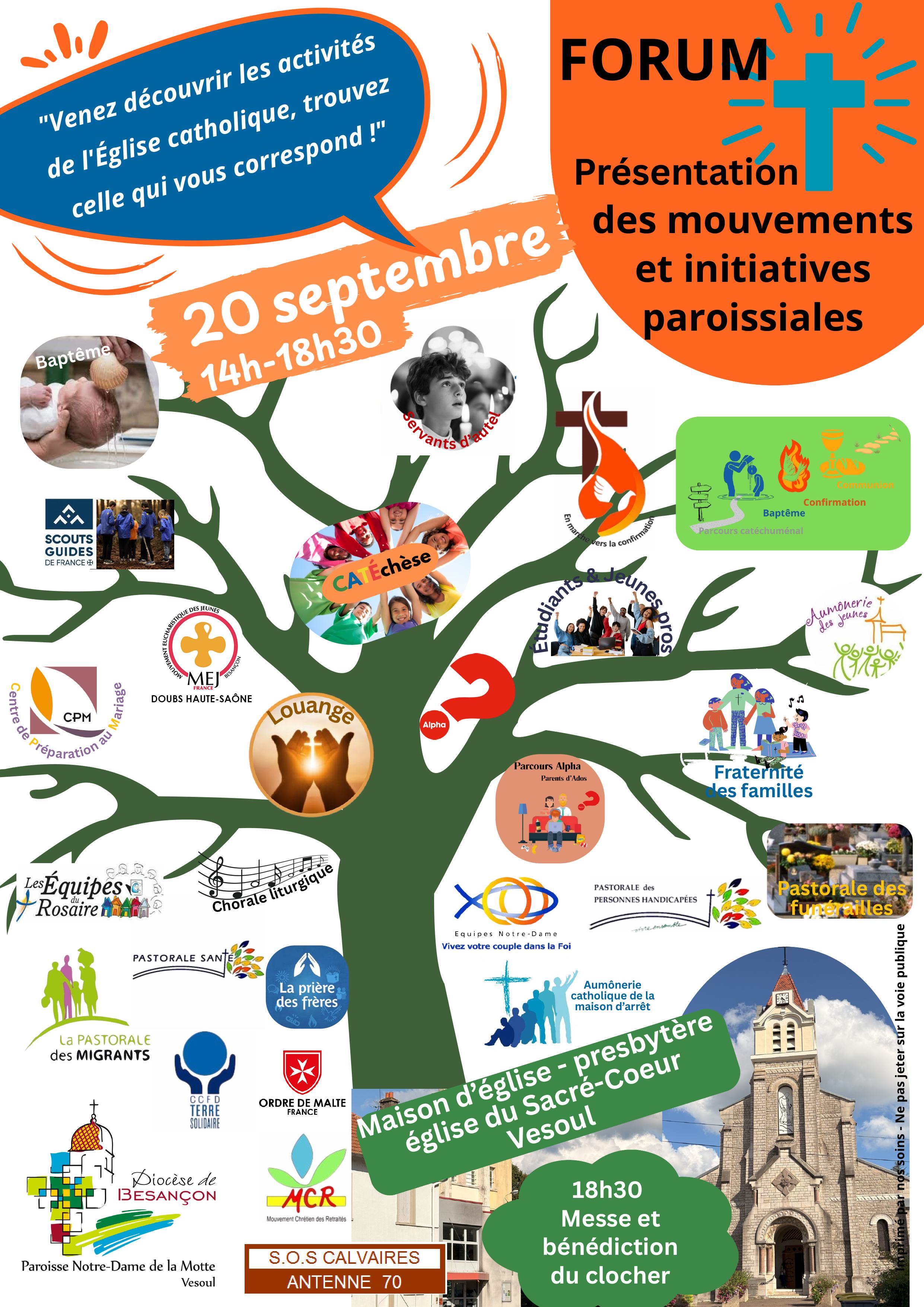 Forum des mouvements et initiatives paroissiales Le samedi 20 septembre, de 14h à 18h30, pour découvrir - ou redécouvrir - la vie de notre paroisse. Messe à 18h30.